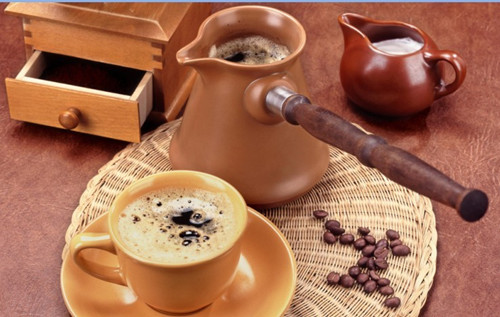 土耳其咖啡是一种文火慢煮的工艺,一小壶咖啡(约50ml左右)要煮10分钟左右,将浅焙咖啡研磨到极细程度(如同面粉)适量,放进精致土耳其壶,适量白糖、适量冷水,置于小火煮沸三次,直至表面出现绵密咖啡泡沫且咖啡呈近粘稠状然后饮用。